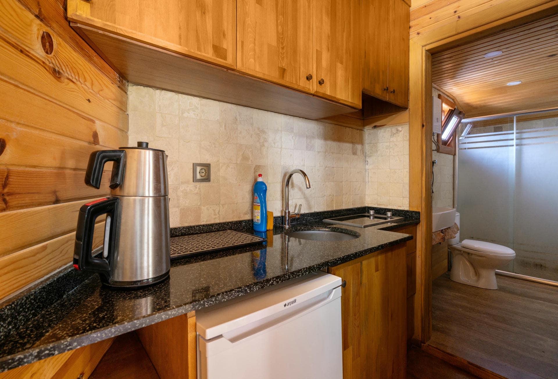 Stüdyo olarak tasarlanan bungalovlarımızda 1 adet çift kişilik yatak ve 1 adet çekyat bulunmaktadır. Talebe göre 1 adet ekstra portatif tek kişilik yatak eklenebilmekte ve maksimum 4 kişi konaklayabilmektedir.