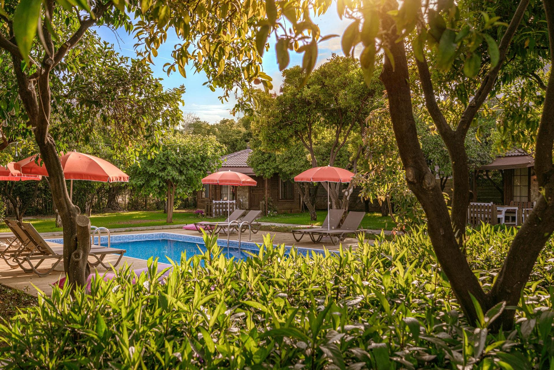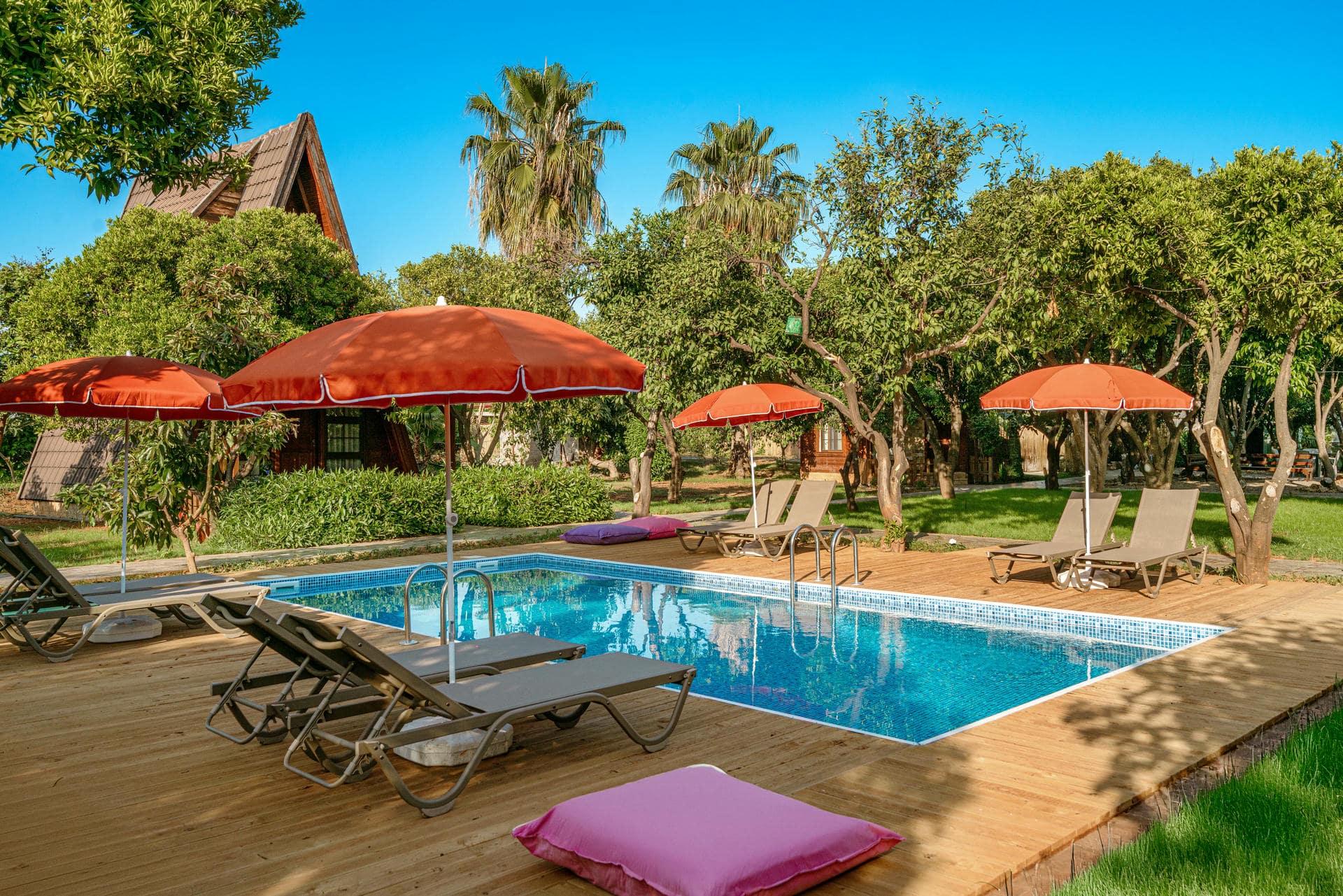 Mandalina ağaçları altında havuz keyfi ve sakin bir plaj deneyimi.